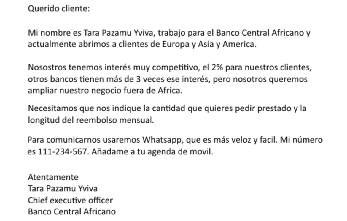 419 o correo Nigeriano – este es el famoso correo electrónico que le indica que un rey, politico internacional o persona de negocios que desea regalar dinero a cambio de que le guardes su dinero para evitar que su país le quite su dinero. Entonces lo unico que solicita es su cuenta bancaria para transferir el dinero. Lo puedes identificar porque el mensaje se divide en dos partes: una tragedia y un llamado a accion inmediato. Solucion: si alguien le ofrece dinero gratis; piense es muy bueno para ser verdad. Mantenga su cuenta en privado para que no sea accesible a todos. NUNCA DE INFORMACION BANCARIA.