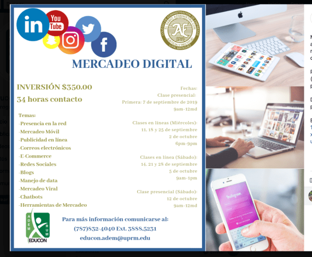 Recuerda que los temas que hablo en este blog son para despertar la curiosidad y que desees aprender mas de lo que esta pasando en este mundo de mercadeo digital. Comparte y comenta para que otros puedan leer sobre estos temas. Te recuerdo que la Certificación de Mercadeo Digital que ofrezco en el Recinto Universitario de Mayaguez comienza en septiembre y aquí esta la información.