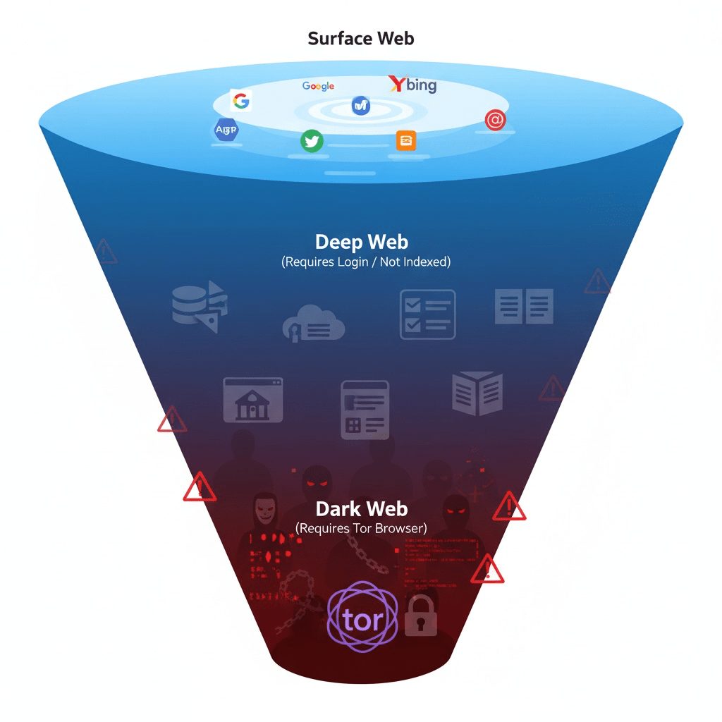 Aunque a menudo se confunde con el dark web, la deep web es mucho más amplia. El dark web es solo una pequeña porción de la deep web que utiliza redes anónimas para acceder a sitios con dominios como «.onion», frecuentemente asociados con actividades anónimas, tanto legales como ilegales.