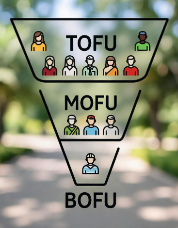 Como siempre ste artículo está escrito para tí, dueño de negocio o emprendedor, que revisas las métricas a medianoche y te preguntas por qué con 10,000 visitas solo vendes 50 productos. Para tratar de explicar de forma visual imagina un embudo que tiene tres partes: Ancho o entrada por arriba (TOFU)- por donde entra todo, en nuestro caso mucha gente. Estrecho o el medio (MOFU)- es la parte que hay menos personas por el espacio y fino o la punta abajo (BOFU)- donde están solo unos pocos pero los valiosos.